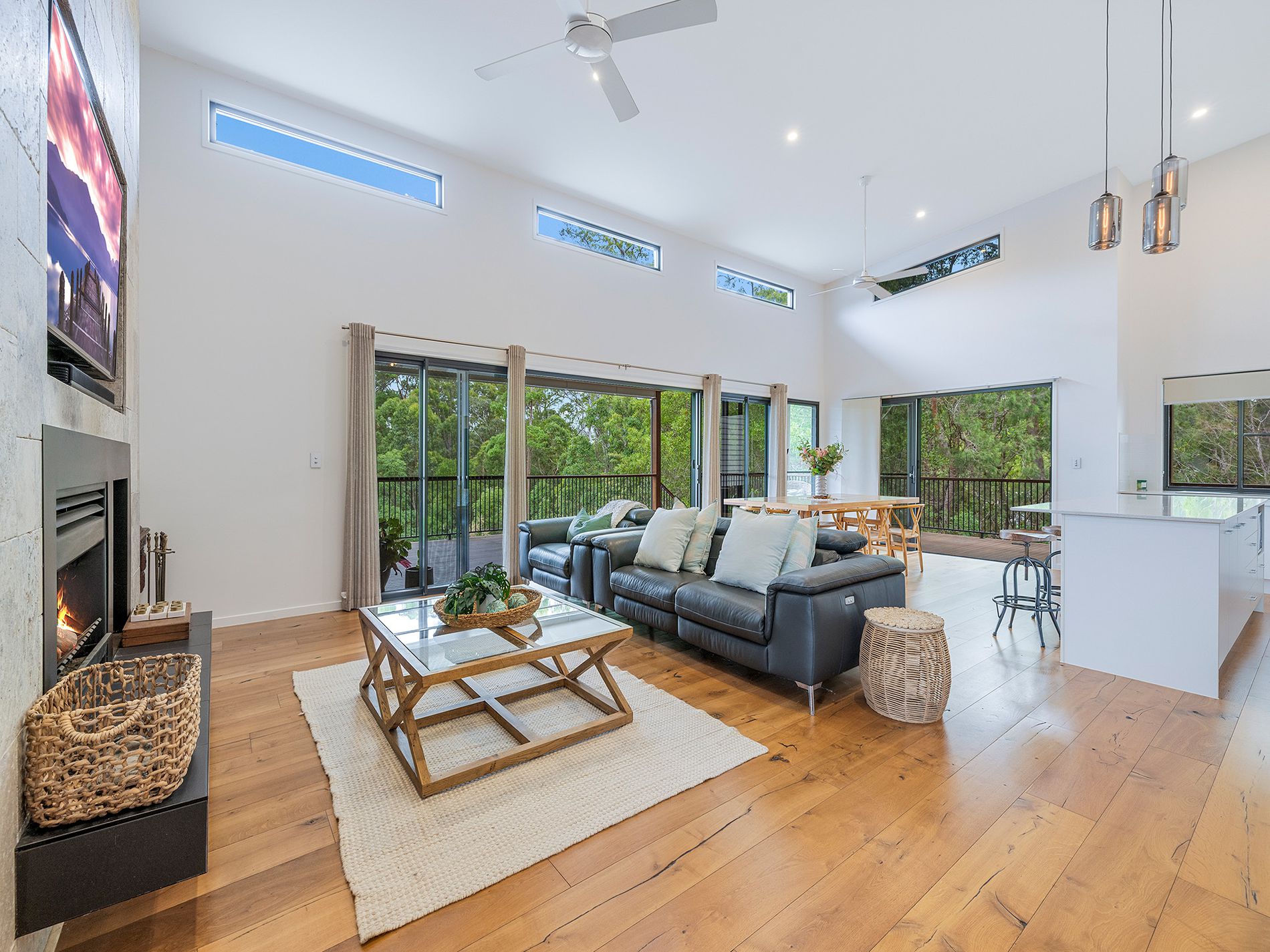 Enjoy year-round comfort with ducted and zoned air-conditioning, louvred windows to invite cross breezes, and a stunning open fireplace for cosy winter nights. Expansive glass sliders open to an entertainer's deck overlooking the rainforest and seasonal gully - a breathtaking backdrop for gatherings or quiet moments alike.