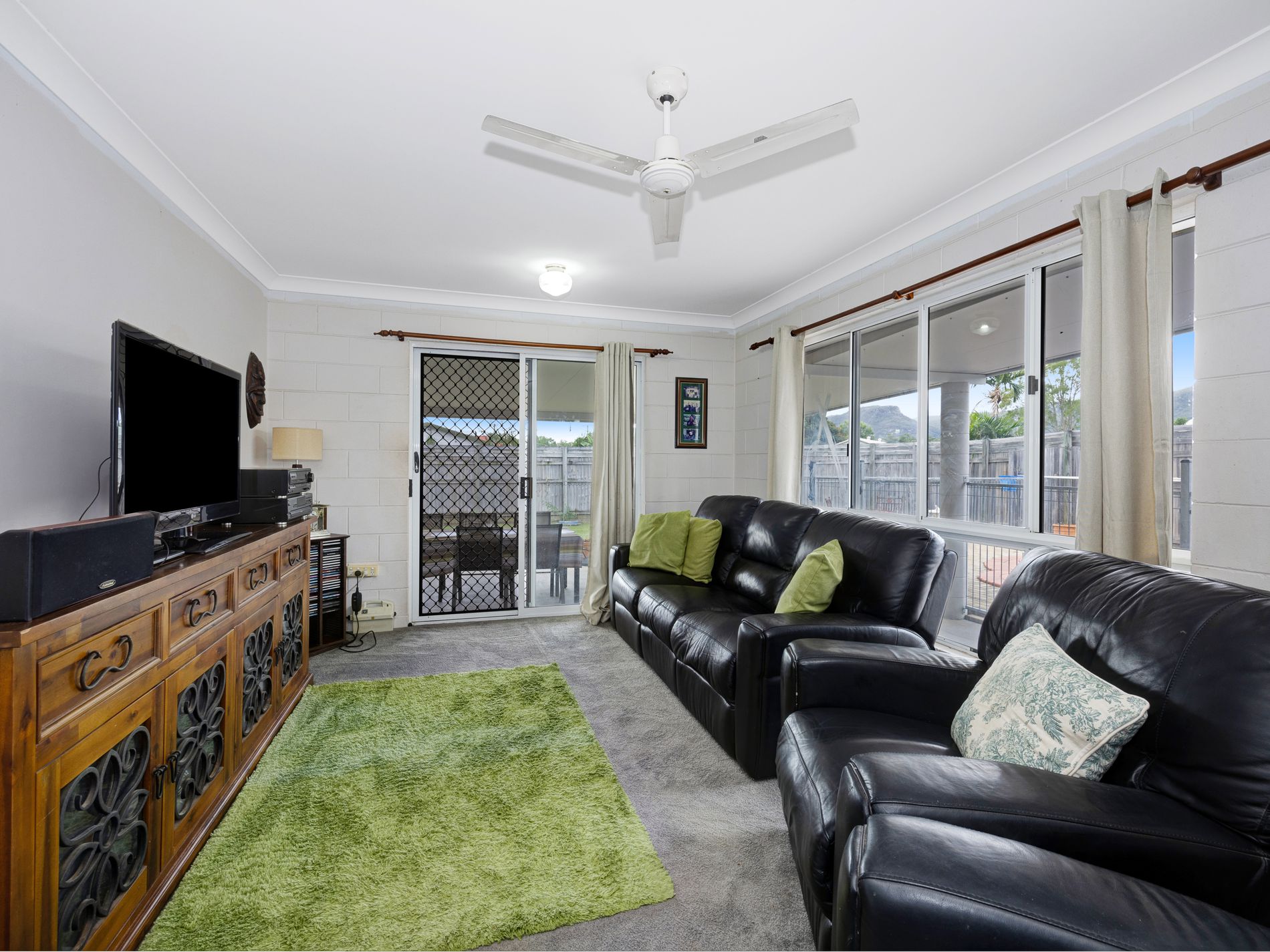This solid four-bedroom, two-bathroom home is designed for easy living, with air conditioning to the main living area and three of the bedrooms, complemented by ceiling fans throughout for year-round comfort. The home features carpeted living and bedroom spaces, creating a warm and inviting feel.